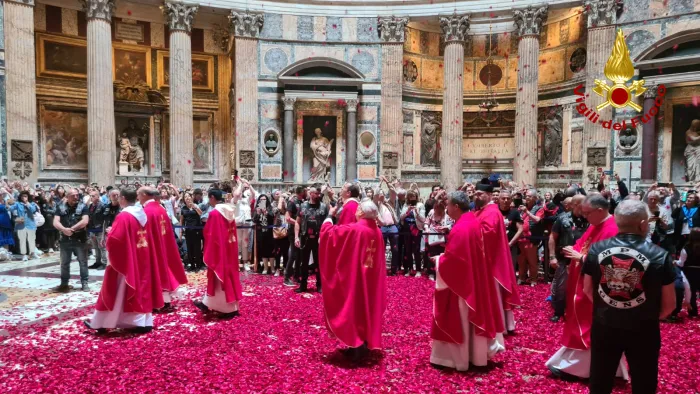 Petali rossi dall'occhio della cupola del Pantheon, a Roma, a simboleggiare la discesa dello Spirito Santo sulla Madonna e sugli Apostoli.