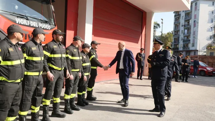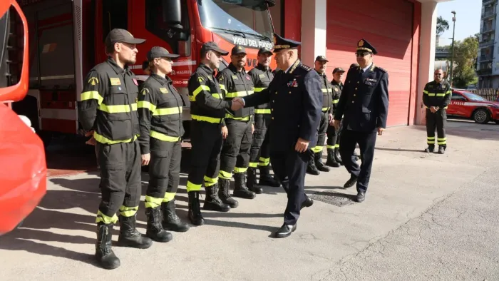 Il Sottosegretario Emanuele Prisco e Capo del Corpo Eros Mannino incontrano il personale intervenuto per la rapina alla banca la scorsa settimana. “Grazie per la capacità operativa e per il coraggio mostrato” ha detto Prisco alla squadra che ha contribuito alla liberazione degli ostaggi sfondando una delle vetrate.