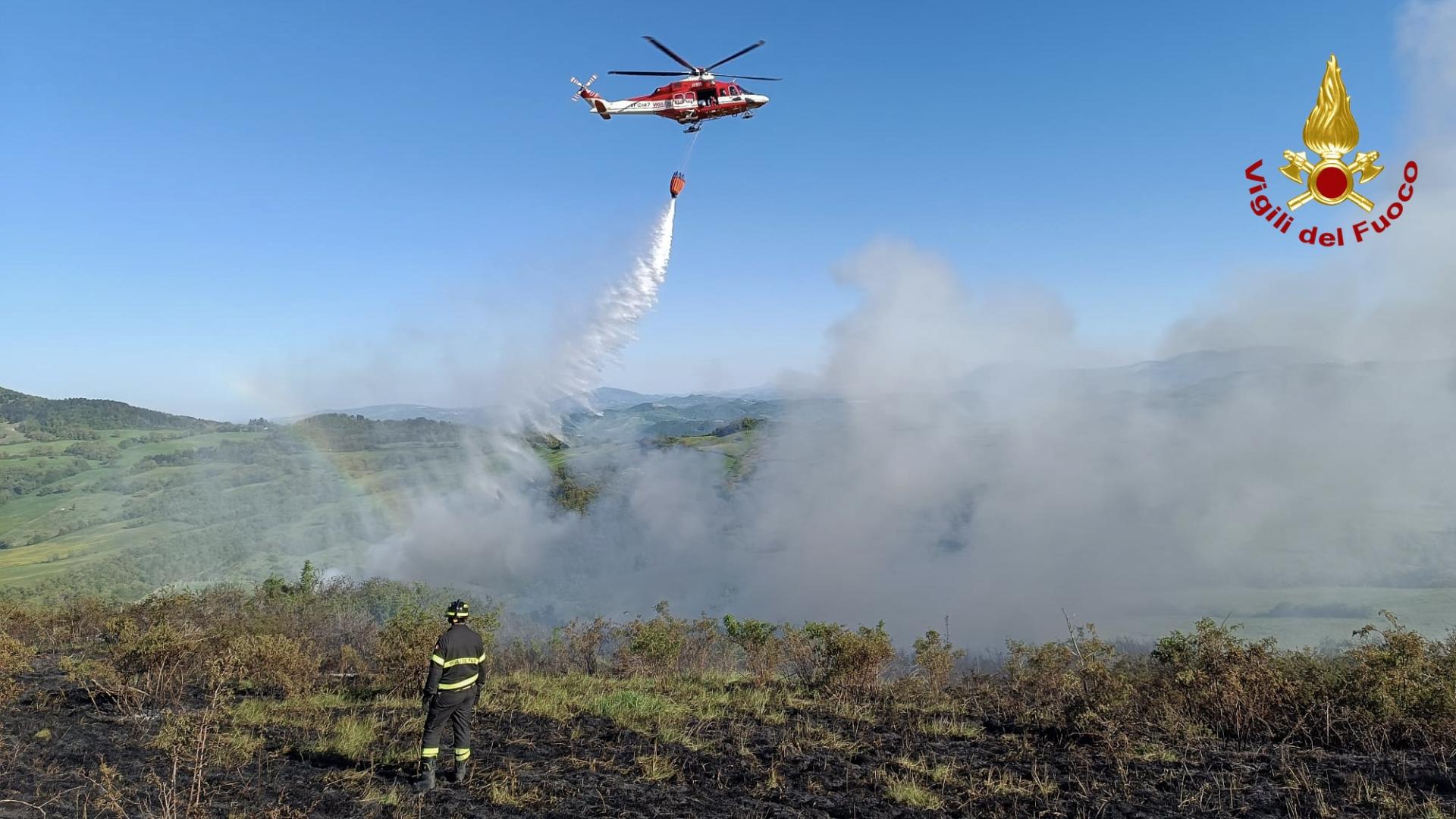 Dal pomeriggio vigili del fuoco impegnati a Montecopiolo per le operazioni di spegnimento di un incendio che ha interessato 3 ettari di sterpaglie e rovi: in azione squadre a terra ed elicottero Drago del Reparto Volo di Bologna. Intervento in corso