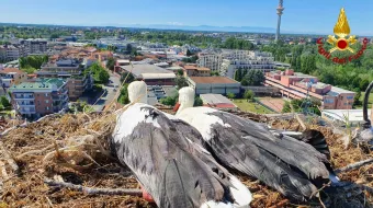 venerdì 09 luglio 2021 - tornata al sicuro una coppia di cicogne bianche grazie ai vigili del fuoco che hanno operato a 50 metri di altezza. il loro nido era…