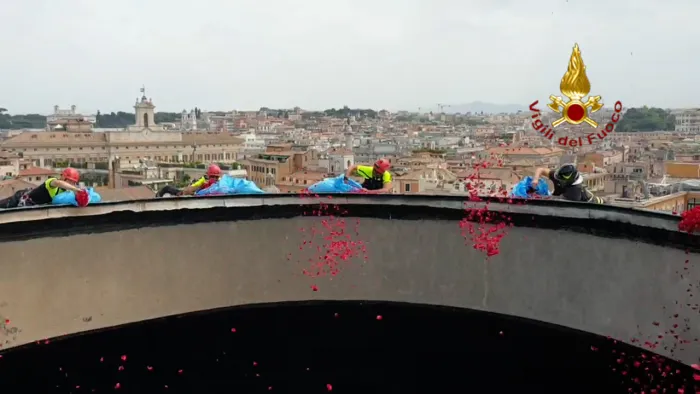 una pioggia di petali rossi giù dall’occhio della cupola del pantheon, a roma. lo spettacolare lancio effettuato dai vigili del fuoco oggi, nel giorno della…