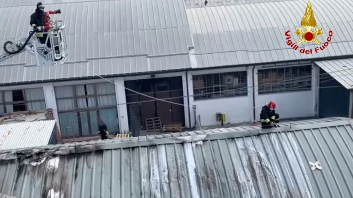 quattro squadre dei vigili del fuoco al lavoro dalle ore 11 a fano per l'incendio di una parte di tetto di un'azienda che lavora alimenti. sezionate le parti…