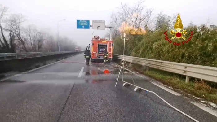 intervento dei vigili del fuoco oggi intorno alle 6 per spegnere l'incendio di un mezzo pesante, che trasportava alimenti, sulla tangenziale sud, a brescia,…