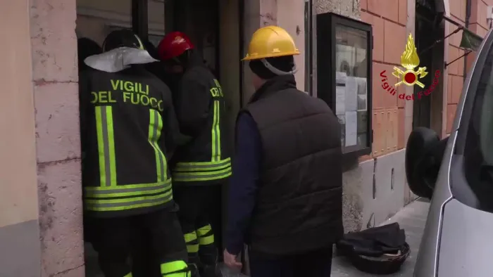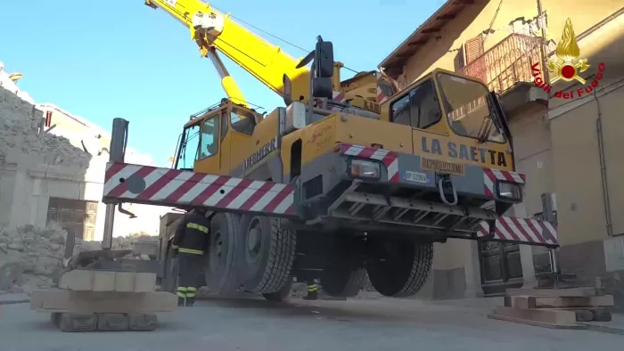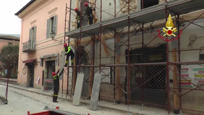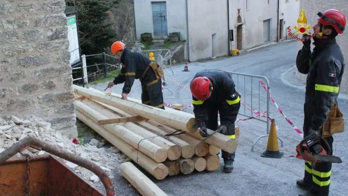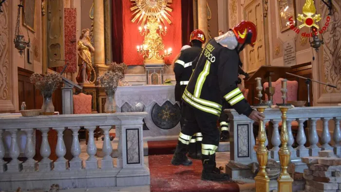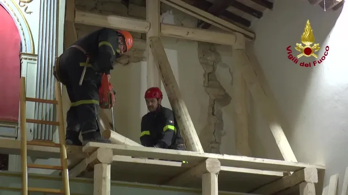 prosegue il lavoro dei vigili del fuoco, attraverso il posizionamento di opere provvisionale, per il consolidamento all'interno della chiesa di s. lorenzo