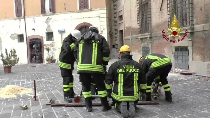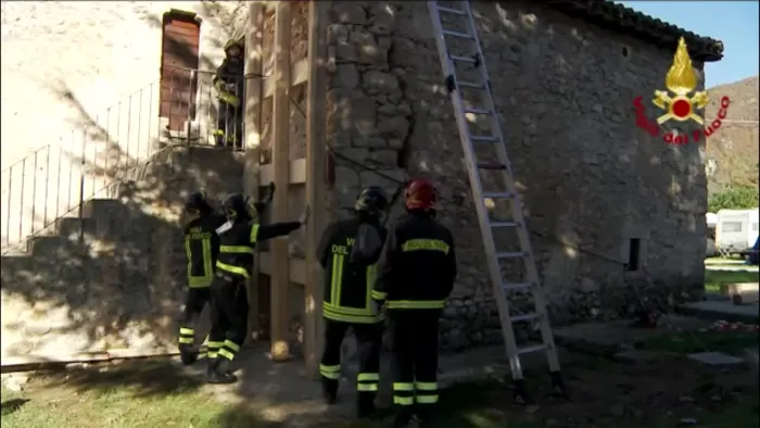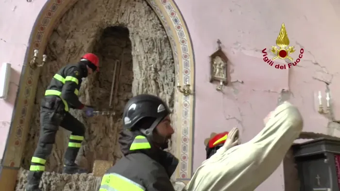 ussita (mc), località pieve – i vigili del fuoco, dopo aver montato un’impalcatura dietro l’altare maggiore all’interno della chiesa romanica del 1300 di santa…