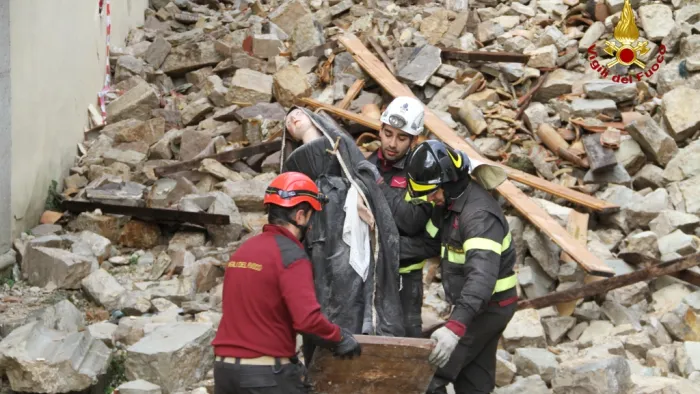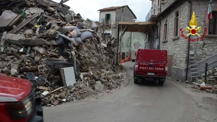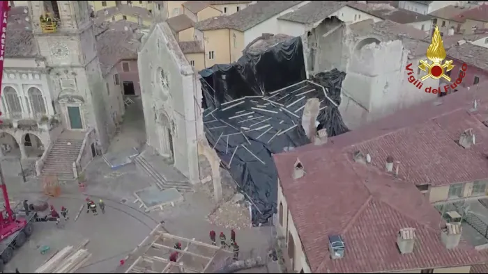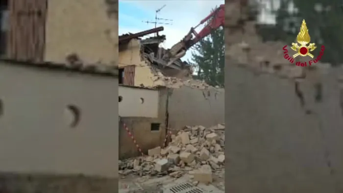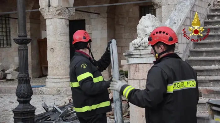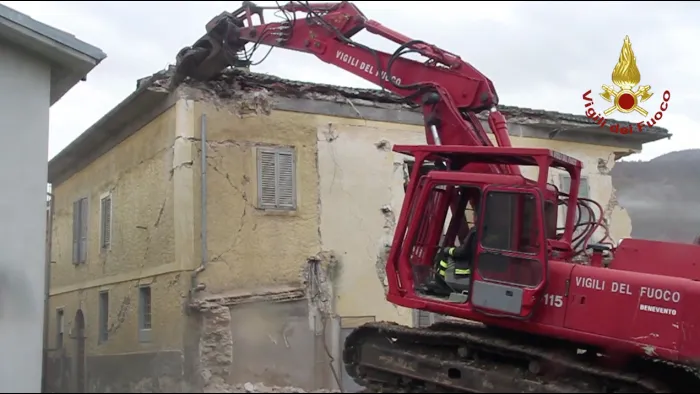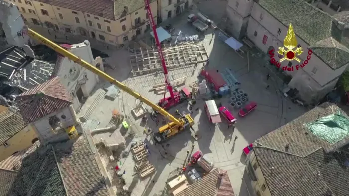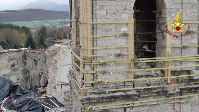 lavori di demolizione presso un'abitazione in località piediripa di norcia e lavori sulla cinta muraria della città umbra.