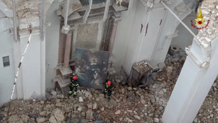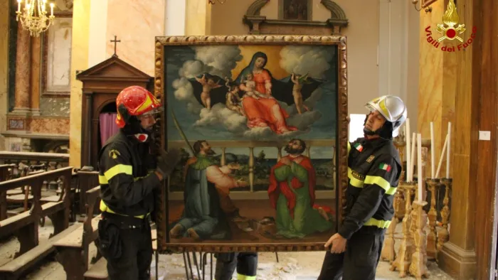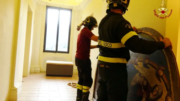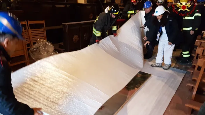 nella giornata odierna i vigili del fuoco presenti nel campo base di norcia hanno provveduto al recupero di opere religiose di pregio all'interno della chiesa…