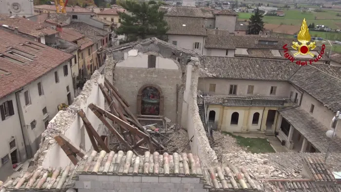 riprese effettuate da droni sulla cittadina e sui resti della cattedrale di s.benedetto