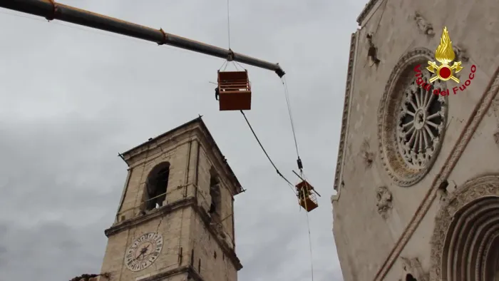 norcia (pg) - avanzamento lavori di cerchiaggio della torre civica