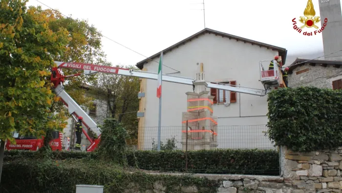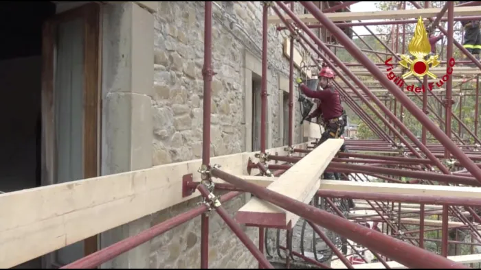 in linea le operazioni dei vigili del fuoco per lo smontaggio controllato di un'abitazione