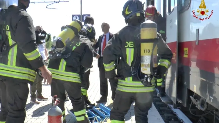 i vigili del fuoco di ancona sono intervenuti a varano per incendio quadro elettrico in un vagone del frecciabianca 9818 diretto da lecce a milano.