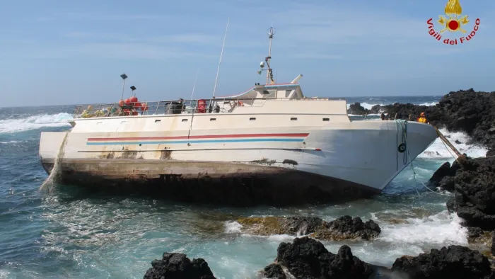 i vigili del fuoco del distaccamento di lampedusa stanno operando sul peschereccio incagliatosi sulla costa di linosa il 21 marzo, per lo svuotamento di 10000…