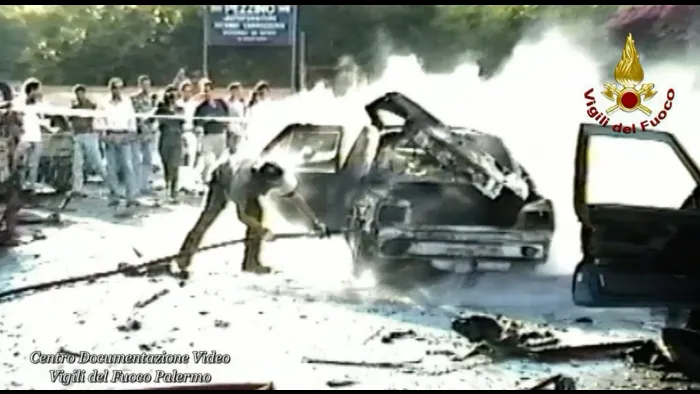 strage di via d'amelio: i vigili del fuoco ricordano il magistrato borsellino e gli agenti della sua scorta uccisi dalla mafia.